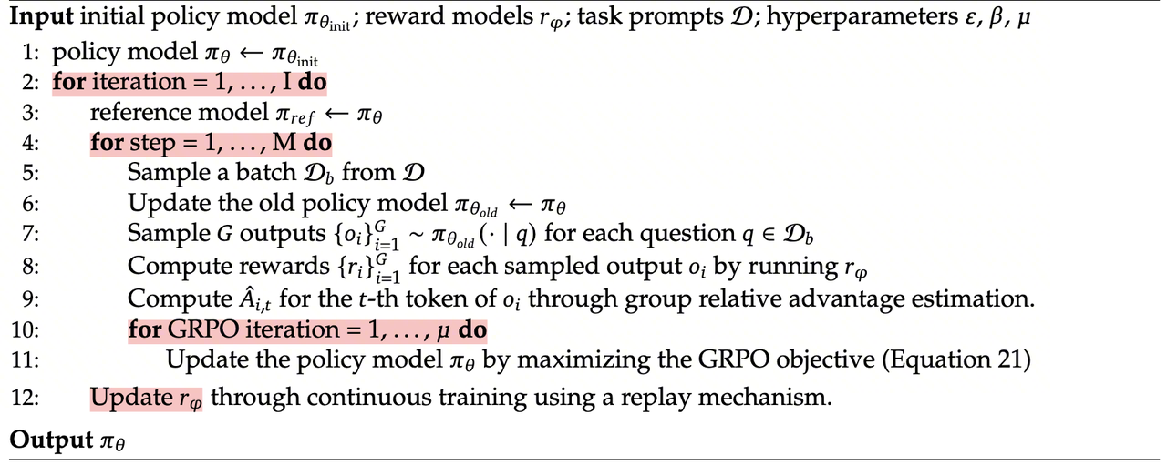 更新 RM(可选):DeepSeekMath 的特色设计——边训策略边优化奖励模型 \(r\_\\phi\),形成”裁判与选手共同进步”的迭代。