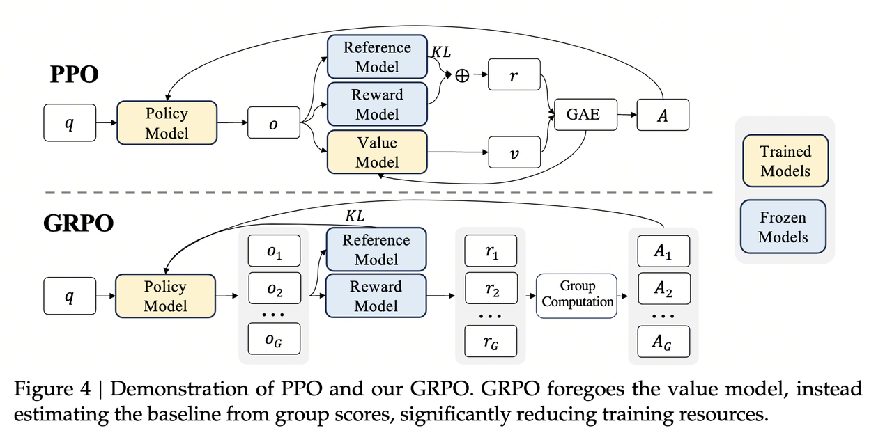 有没有一条中间路线——保留 RL 的在线采样优势,但去掉最沉重的 Critic 网络? Group Relative Policy Optimization(GRPO)正是这个思路的产物。它由 DeepSeek 团队在 2024 年的 DeepSeekMath 论文中提出,核心创新只有一句话: